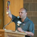 Kevin gives a speech at a Special Olympics New York event and holds his medals.